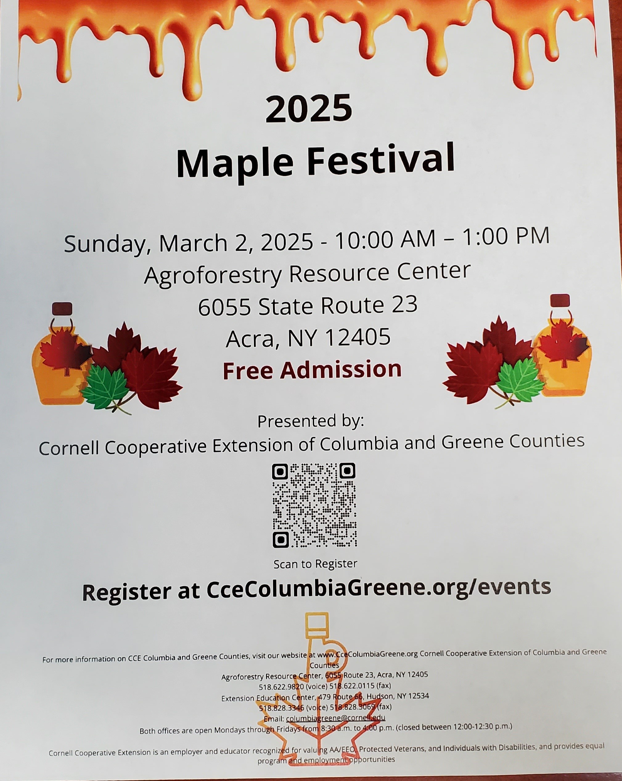 Cornell Cooperative Extension of Columbia and Greene Counties is hosting the 2025 Maple Festival at the Agroforestry Resource Center in Acra, NY on March 2, 2025 from 10 am – 1 pm.