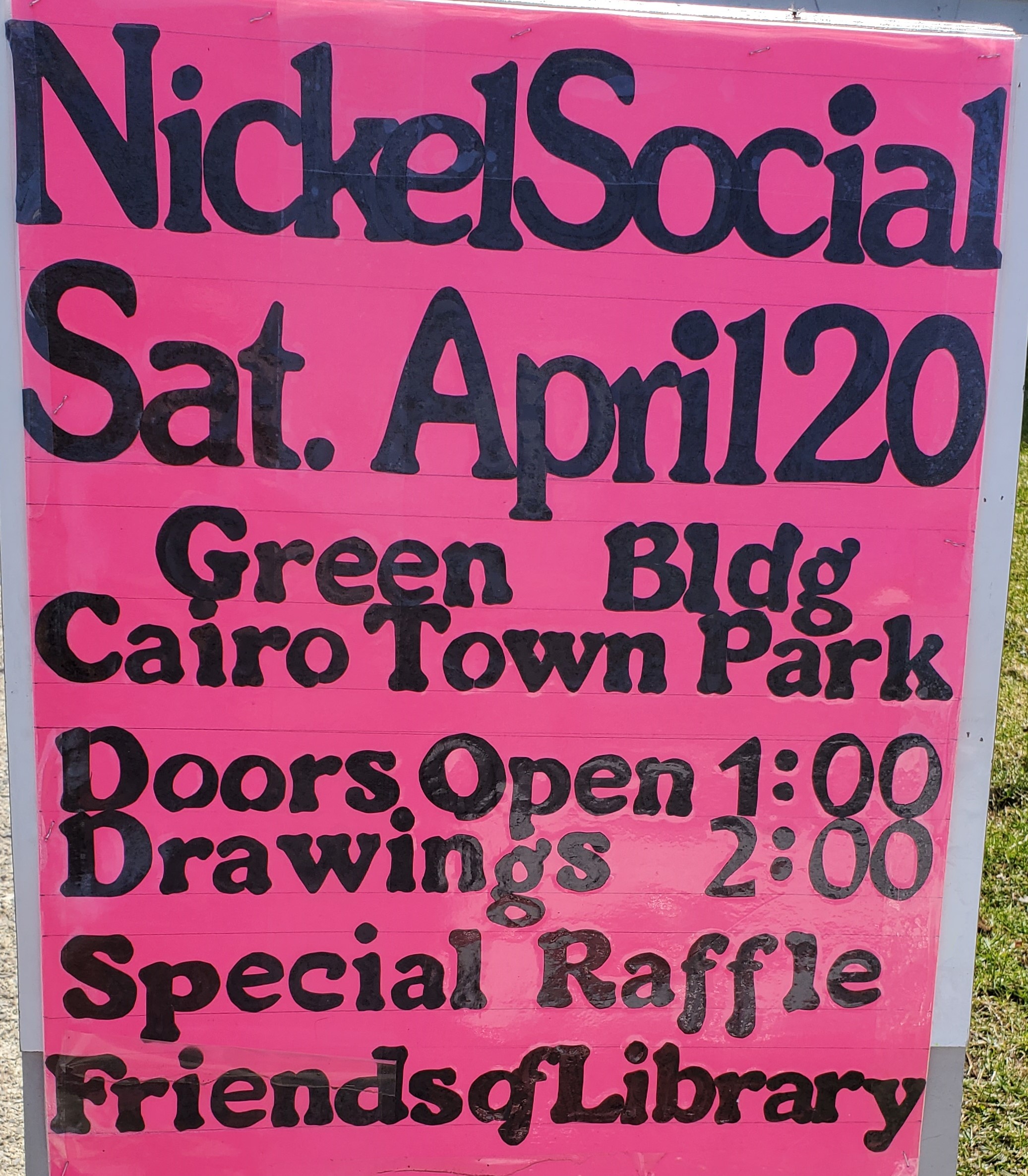 The Friends of the Library is holding a Nickel Social in the Green Building at the Angelo Canna Town Park on April 20, 2024.