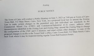 The Town of Cairo will be holding a Public Hearing on the proposal to amend the Cairo Zoning Law on June 5, 2023 at 7pm in the Town Hall Meeting Room.