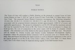 The Town of Cairo will be holding a Public Hearing on the proposal to extend the Town of Cairo Sewer District on June 5, 2023 at 7pm in the Town Hall Meeting Room.