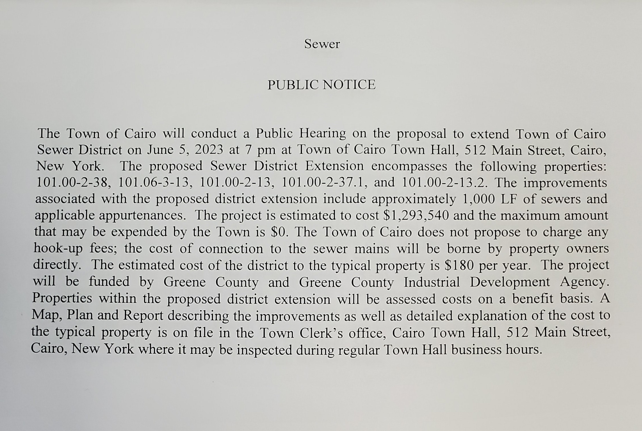 The Town of Cairo will be holding a Public Hearing on the proposal to extend the Town of Cairo Sewer District on June 5, 2023 at 7pm in the Town Hall Meeting Room.
